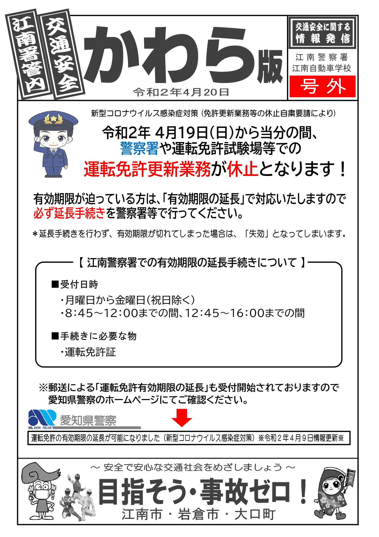 令和2年4月19日(日)から当分の間、警察署や運転免許試験場等での運転免許更新業務が休止となります!